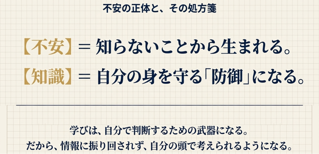 学ぶことは、将来への不安を減らす「備え」になると感じました。